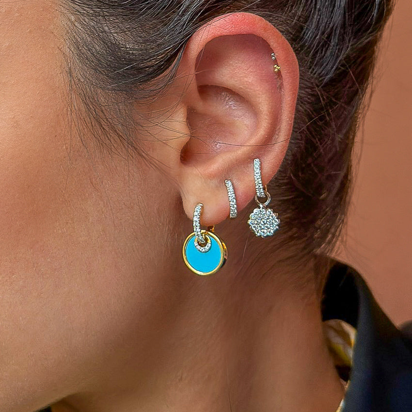 Gold Huggies with Diamond and Turquoise Circle Drops